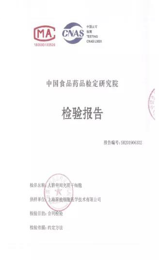 中國食品藥品檢定研究院,是國家檢驗藥品生物制品質量的法定機構和最高技術仲裁機構,具有實驗室認可(CNAS)和資質認定(CMA)資格的國家級檢定實驗室。中檢院檢驗報告是和三甲醫院開展間充質干細胞臨床研究的必備條件之一。
