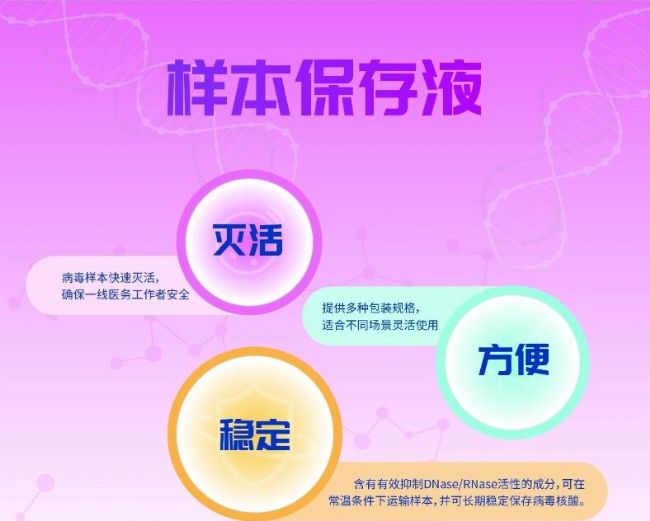 滅活:該保存液能夠迅速滅活樣本中可能存在的病毒,采樣同時快速滅活,迅速切斷傳染源,保證醫護人員安全。