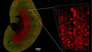 蔡司Lightsheet 7成像物鏡5×/0.16foc獲得的小鼠腎臟圖像。借助三維全器官成像和圖像分析,可以更好地理解各種腎臟疾病的機(jī)理,例如糖尿病。