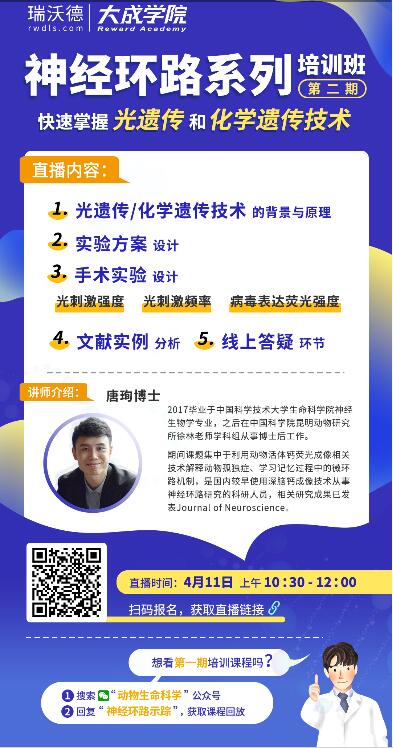 來聽神經環路研究第二期課程就對了!4月11日上午10:30-12:00唐珣老師為你詳解光遺傳與化學遺傳技術那些事,還有文獻實例分析和線上答疑環節,千萬不要錯過!
