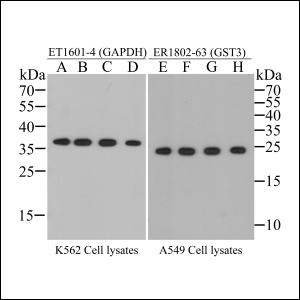 Western blot analysis of rabbit anti-GAPDH antibody (ET1601-4,1/2000) and rabbit anti-GST3 antibody (ER1802-63, 1/1000) with K562 Cell and A549 Cell lysates (All lanes proteins at 10 µg per lane). 1:40,000 (Lane A, E), 1:80,000 (Lane B, F), 1:160,000 (Lane C, G) and 1:320,000 (Lane D, H).