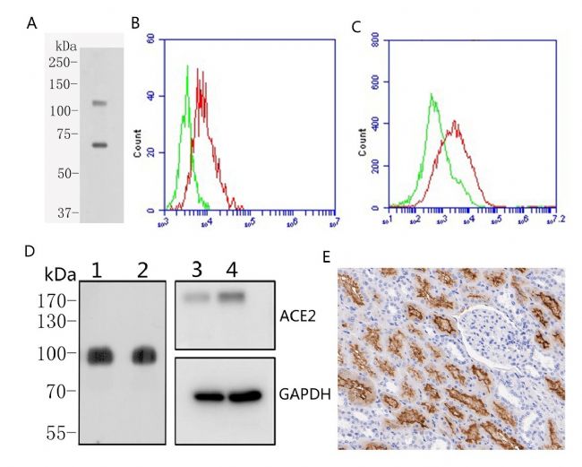 E.Immunohistochemical analysis of paraffin-embedded human kidney tissue using anti-ACE2 antibody (ET1611-58).