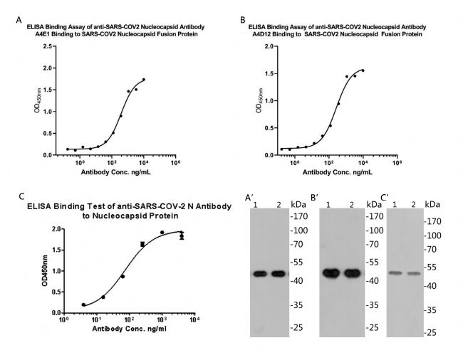 Fig A', B', C': Western blot analysis of anti-SARS-CoV-2 Nucleocapsid Protein antibody with N-terminal His tag-tagged SARS-CoV-2 Nucleocapsid protein (1) and inactivated native SARS-CoV-2 lysate (2) at 20ng. A', ER1902-39; B', EM1902-20; C', EM1902-21.