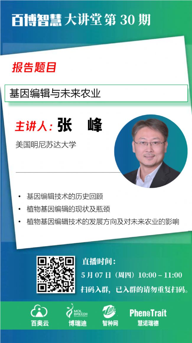 為幫助大家了解知識產權保護、育種研發服務、種質資源托管、基因型分型、基因編輯、表型組學、人工智能和育種大數據等前沿技術,同時也為同行們相互交流提供更多的機會,由百奧云、博瑞迪、智種網和慧諾瑞德等新銳力量秉持資源整合、平臺共享、匯聚眾智、創新引領的原則,聯合組織公益性線上學習平臺——百博智慧大講堂,邀請行業經驗豐富的專家、老師進行線上交流,共同探討新形勢下種業發展思路,共同“破冰”。