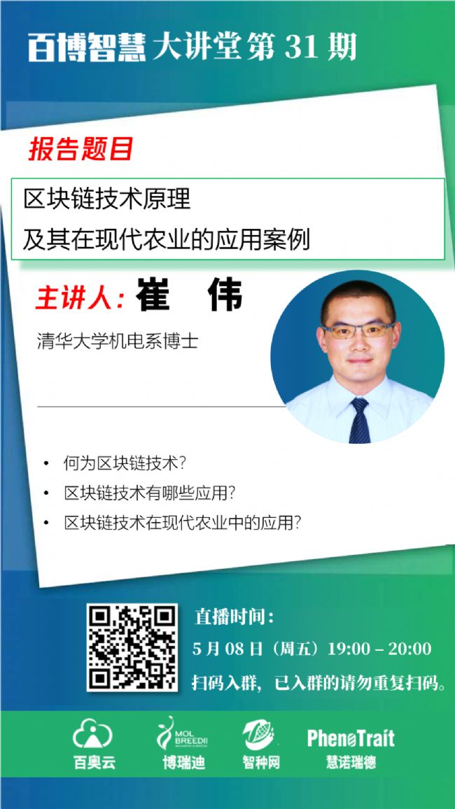 百博智慧大講堂自3月5日開播以來,短時間內引起強烈關注。在已結束的直播中,哈佛大學/北京大學林澤川博士、中國農業科學院作物科學研究所肖永貴博士、東北農業大學陳慶山教授、金玉良種劉定富董事長、明尼蘇達大學梁智凱博士、丹佛斯植物科學中心李茂博士、中國農業科學院作物科學研究所金秀良研究員、北京農林科學院溫常龍博士、華中農業大學楊萬能教授、百博智慧大講堂四位創始人王冰冰/張嘉楠/葉劍/韓志國、北京農林科學院趙久然研究員、南京農業大學/法國農業科學院劉守陽博士、中國科學院植物生理生態研究所宋青峰博士、澳大利亞科學院鄭邦友博士、著名農業評論員張鑫先生、法國農業科學院Christophe Salon教授、中國科學院遺傳與發育生物學研究所農業資源研究中心劉秀位研究員、內布拉斯加大學林肯分校葛玉峰副教授、中國農業科學院作物科學研究所徐建龍研究員、青島清原農冠集團研發總監劉丙新先生、北京農業信息技術研究中心張穎博士、中國農業大學馬韞韜博士、山東省農業科學院孫琦博士、中國科學院遺傳與發育生物學研究所田志喜研究員、華南農業大學郭濤教授、武漢大學吳賢婷博士、云南省農業科學院番興明研究員、中國農業科學院作物科學研究所徐云碧研究員等帶來了28場精彩的報告。