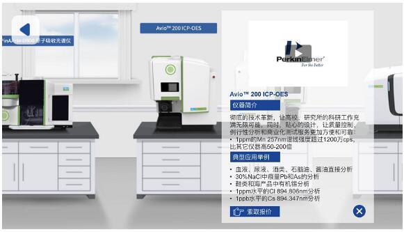 除了實景實驗室,我們同時還設(shè)計了兩個虛擬實驗室。這里陳列了珀金埃爾默生命科學(xué)和分析化學(xué)產(chǎn)品線的主要產(chǎn)品。您可以在虛擬實驗室了解到每一臺儀器的參數(shù)、應(yīng)用、使用視頻、圖片等全方位的信息。