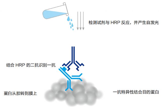 · HRP 結合的二抗與一抗結合后,特異性結合到膜上的目標蛋白。在加入魯米諾過氧化物檢測試劑后,HRP 酶在多步反應中催化魯米諾的氧化。
