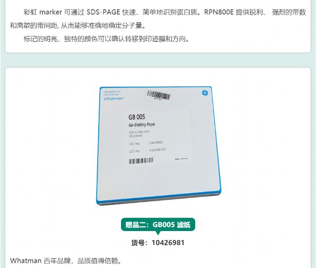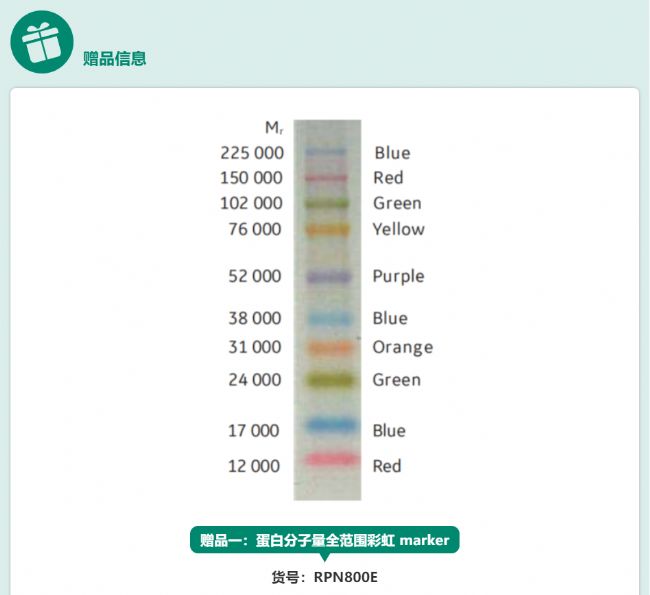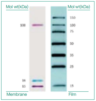 一種具有雙重功能的蛋白 western bolt 檢測分子量標準,它可以直接從膠上或者膜上觀察到 3 個彩色條帶,同時另外七個 Mr 15,000-150,000 含有重組蛋白的標記,通過化學發光與目的條帶一起被檢測出來。