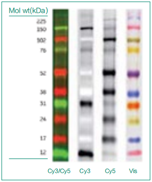 專為熒光 Western blot 設計,包含 Cy3 和 Cy5 雙通道 Marker,同時也帶彩色預染,可從凝膠或膜上直接觀察 Marker 。