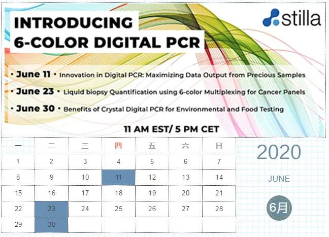 與此同時法國Stilla Technologies公司推出系列講座,分享Naica™ 六通道數字PCR系統的功能,并介紹6色通道檢測簡化工作流程和多種應用案例,小編奉上時間和日程,快快進行注冊吧。