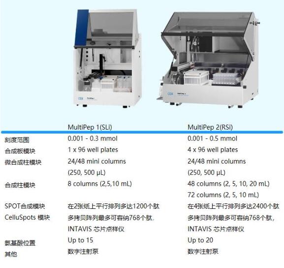 Intavis系列產品包括高通量自動平行多肽合成儀、高通量多肽裂解系統、全自動原位雜交儀、全自動蛋白消化儀等,其獨特的機器人合成技術,與CEM的微波多肽合成儀系列產品相互補充。例如:Intavis公司的MultiPep系列產品,可以在一種獨特的纖維素膜上合成大量不同多肽,整個多肽陣列合成過程可以在ResPep上自動完成。最多可以通過軟件自由設定2400個點樣位。該方法論已在400多篇科學文章中得到論證,可用于分析蛋白質之間的相互作用、在纖維素膜上進行直接篩選等。相比之下, CEM的肽合成技術可以非常快速和高效的合成肽,適合更大規模的肽生產。