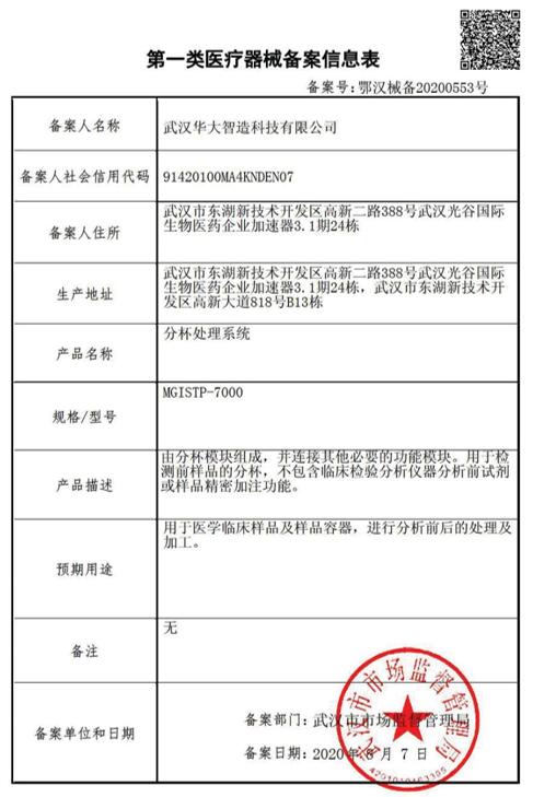 2020年8月7日,深圳華大智造科技股份有限公司(以下簡稱“華大智造”)最新研發(fā)的全自動MGISTP-7000分杯處理系統(tǒng)正式獲得國家藥品監(jiān)督管理局NMPA一類醫(yī)療器械認證。該系統(tǒng)是一款專業(yè)針對樣本采集管的全自動分杯處理系統(tǒng),原管帶蓋上樣,一鍵傻瓜操作,全程樣本零接觸,可在40分鐘內(nèi)完成192例樣本從單管到96孔板的快速精準分裝以及該過程中的信息處理。