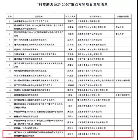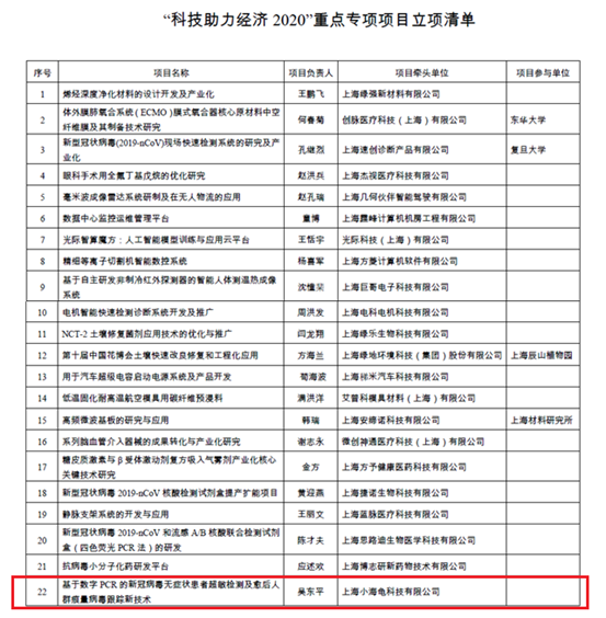 根據(jù)《科技部關(guān)于組織推薦“科技助力經(jīng)濟(jì)2020”重點(diǎn)專(zhuān)項(xiàng)項(xiàng)目的通知》(國(guó)科發(fā)資〔2020〕81號(hào))要求,經(jīng)申報(bào)、遴選推薦、公示和科技部審核同意,上海市立項(xiàng)了50個(gè)重點(diǎn)科技項(xiàng)目。小海龜科技“基于數(shù)字PCR的新冠病毒無(wú)癥狀患者超敏檢測(cè)及愈后人群痕量病毒跟蹤新技術(shù)”項(xiàng)目入選,榮獲科技部立項(xiàng)支持。