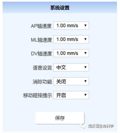 a、在PC端軟件界面三個軸對應位置可分別輸入移動速度進行調節,其中AP軸和ML軸4種移動速度可選:2.00mm/s、1.00 mm/s、0.50 mm/s、0.20 mm/s;DV軸7種移動速度可選2.00 mm/s 、1.00 mm/s、0.50 mm/s、0.20 mm/s 、0.01 mm/s、0.005 mm/s、0.001 mm/s。