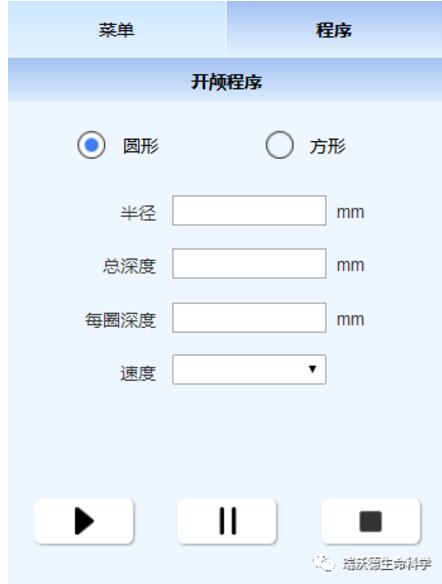 方形或圓形2種形狀可選,長寬或直徑參數輸入范圍:0~20mm,深度輸入范圍:0~20mm,支持27G、30G 2種針頭規格,6個梯度的密度系數設置1-6,AP軸和ML軸4種移動速度可選,DV軸7種移動速度可選。