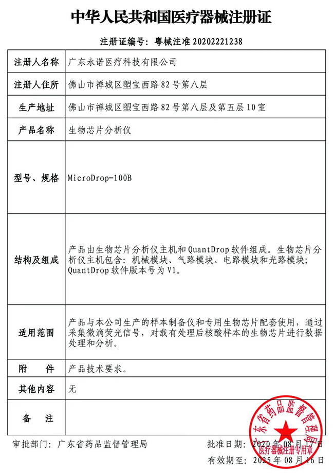 近日,經廣東省藥品監督管理局審批,廣東永諾醫療科技有限公司MicroDrop-100B生物芯片分析儀正式獲批醫療器械注冊證。至此,MicroDrop®微滴式數字PCR系統全套系統均獲批醫療器械注冊證!