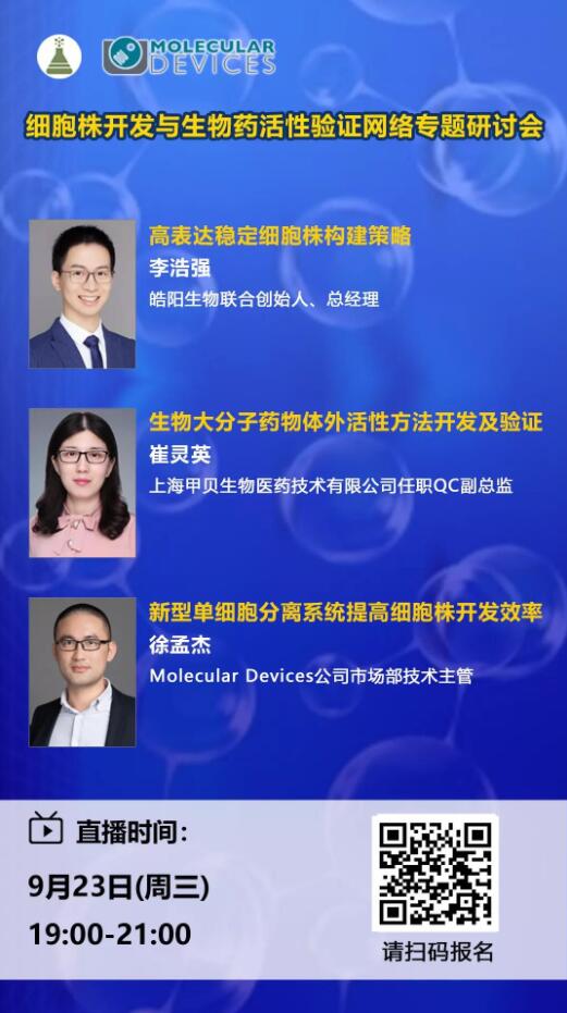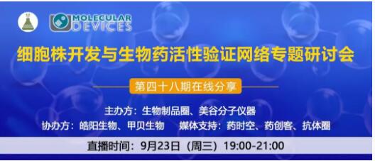 醫藥行業美好而競爭激烈,而生物藥的發展在行業中越來越得到各大制藥公司的重視。而好的穩定細胞株適用于藥物研發的各個階段,如重組蛋白和抗體生產、檢測分析、功能性研究等等。通過穩定細胞株高產量蛋白,可進一步進行體外生物活性研究,通過體外的生物活性研究可推測在體內的活性情況,指導藥物的研發,并為后期臨床試驗提供參考。為了幫助大家學習和掌握穩定細胞株構建的技術,提高細胞株開發效率并指導如何進行生物活性驗證,MolecularDevices聯合生物制品圈將于2020年9月23日19:00-21:00時舉辦專題在線分享,詳細信息如下: