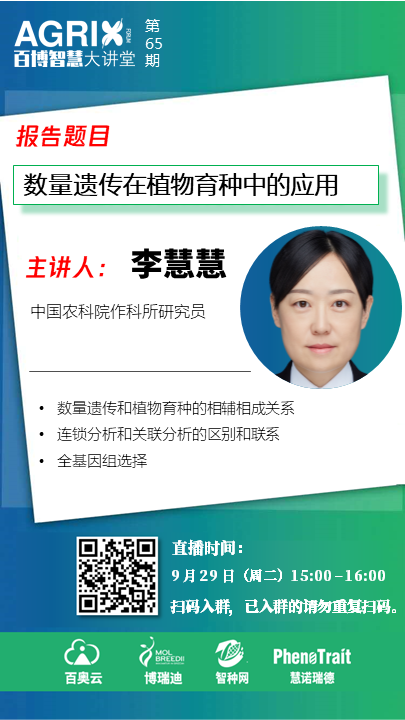 百博智慧大講堂自3月5日開播以來,短時間內引起強烈關注。在已結束的直播中,哈佛大學/北京大學林澤川博士、中國農業科學院作物科學研究所肖永貴博士、東北農業大學陳慶山教授、金玉良種劉定富董事長、明尼蘇達大學梁智凱博士、丹佛斯植物科學中心李茂博士、中國農業科學院作物科學研究所金秀良研究員、北京農林科學院溫常龍博士、華中農業大學楊萬能教授、百博智慧大講堂四位創始人王冰冰/張嘉楠/葉劍/韓志國、北京農林科學院趙久然研究員、南京農業大學/法國農業科學院劉守陽博士、中國科學院植物生理生態研究所宋青峰博士、澳大利亞科學院鄭邦友博士、著名農業評論員張鑫先生、法國農業科學院Christophe Salon教授、中國科學院遺傳與發育生物學研究所農業資源研究中心劉秀位研究員、內布拉斯加大學林肯分校葛玉峰副教授、中國農業科學院作物科學研究所徐建龍研究員、青島清原農冠集團研發總監劉丙新先生、北京農業信息技術研究中心張穎博士、中國農業大學馬韞韜博士、山東省農業科學院孫琦博士、中國科學院遺傳與發育生物學研究所田志喜研究員、華南農業大學郭濤教授、武漢大學吳賢婷博士、云南省農業科學院番興明研究員、中國農業科學院作物科學研究所徐云碧研究員、華中農業大學張建博士、明尼蘇達大學張峰博士、清華大學崔偉博士、華盛頓州立大學張志武教授、北京愛科農科技有限公司郭建明、數溪科技馮欣欣、慕恩生物杜洪志、浙江大學岑海燕研究員、河南農業大學喬洪波教授、中科智能吳曉偉博士、德國Julich研究中心Uli Schurr教授、西北農林科技大學姜雨教授,東京大學郭威博士、西北農林科技大學薛吉全教授、中國科學院海洋研究所相建海研究員、杭州電子科技大學張競成博士、美國愛荷華州立大學王立志博士,鴻翔種業有限公司薛守旺、浙江大學壽惠霞教授、北京屯玉種業郭婷婷、中種國際種子有限公司張春震、澳大利亞阿德萊德大學陸昊博士、長沙百奧云數據科技有限公司總經理王冰冰、慧諾瑞德(北京)科技有限公司總經理韓志國、智種網CEO葉劍、阿德萊德大學劉華健研究員、雜交水稻國家重點實驗室鄧啟云、愛荷華州立大學Mike Castellano和中國農業科學院生物技術研究所陳茹梅、中國科學院遺傳發育所魯非研究員、河南省農業科學院盧為國研究員、石家莊博瑞迪生物技術有限公司吳笑女、山西農業大學王興春教授、西北農林科技大學陳宏教授、黑龍江省農科院錢春榮研究員和南京大學張永光教授帶來了64場精彩的報告。