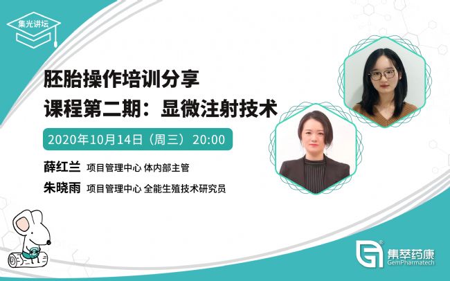 本期集光講壇我們同時邀請到項目管理中心體內(nèi)部主管薛紅蘭老師和全能生殖技術(shù)研究員朱曉雨老師為大家?guī)?strong>《胚胎操作培訓(xùn)分享課程第二期:顯微注射》,相信兩位老師的精彩講述和現(xiàn)場互動定會讓我們收獲滿滿。10月14日(周三)晚8:00,我們不見不散!
