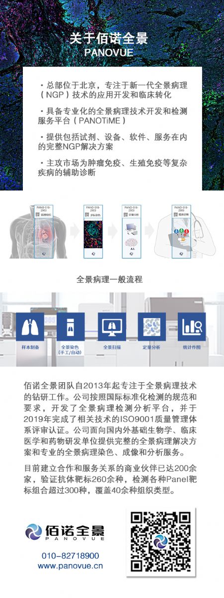 全景病理分析是一種創(chuàng)新型的多靶標病理組織檢測技術(shù),以多靶點組織染色、全景數(shù)字病理掃描、定量病理分析技術(shù)為依托,可以在組織水平實現(xiàn)單細胞精度的多元統(tǒng)計分析,與單細胞測序技術(shù)、多色流式技術(shù)一道,成為細胞組學(xué)時代最重要的研究平臺。尤其在腫瘤免疫、生殖免疫、自身免疫等復(fù)雜疾病的臨床研究和輔助診斷開發(fā)領(lǐng)域,有著重要應(yīng)用價值。