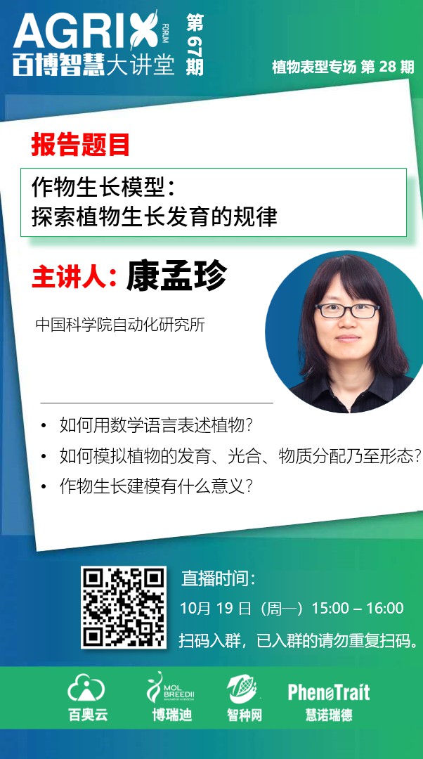 植物表型組學是一門新興學科,近幾年在國內也受到越來越多的關注。但由于植物表型組學涉及不同學科、不同技術、不同尺度、不同維度的交叉應用,因此大家往往感覺“一說就懂,一做就懵”。為此,我們在百博智慧大講堂設置植物表型專場,目前已邀請到來自美國、歐洲、澳洲、日本、中國的20多位專家,將陸續為大家帶來精彩的表型報告。