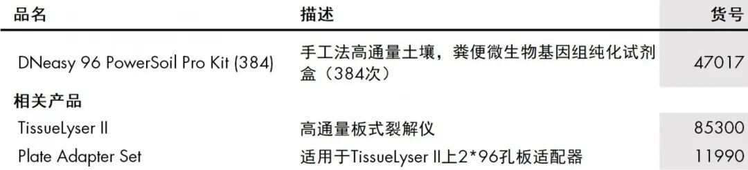 DNeasy 96 PowerSoil Pro Kit的適時出現恰好解決了這個問題。DNeasy 96 PowerSoil Pro Kit含96孔板式硅膠模離心柱,配合離心機或QIAvac96真空底座可以一次手工純化高達96個堆肥,粘土,表層土壤及糞便和腸道樣本。