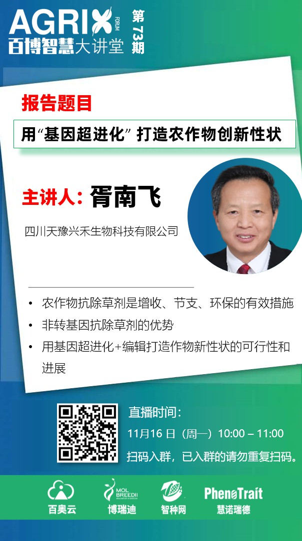 百博智慧大講堂自3月5日開播以來,短時間內(nèi)引起強(qiáng)烈關(guān)注。在已結(jié)束的直播中,哈佛大學(xué)/北京大學(xué)林澤川博士、中國農(nóng)業(yè)科學(xué)院作物科學(xué)研究所肖永貴博士、東北農(nóng)業(yè)大學(xué)陳慶山教授、金玉良種劉定富董事長、明尼蘇達(dá)大學(xué)梁智凱博士、丹佛斯植物科學(xué)中心李茂博士、中國農(nóng)業(yè)科學(xué)院作物科學(xué)研究所金秀良研究員、北京農(nóng)林科學(xué)院溫常龍博士、華中農(nóng)業(yè)大學(xué)楊萬能教授、百博智慧大講堂四位創(chuàng)始人王冰冰/張嘉楠/葉劍/韓志國、北京農(nóng)林科學(xué)院趙久然研究員、南京農(nóng)業(yè)大學(xué)/法國農(nóng)業(yè)科學(xué)院劉守陽博士、中國科學(xué)院植物生理生態(tài)研究所宋青峰博士、澳大利亞科學(xué)院鄭邦友博士、著名農(nóng)業(yè)評論員張鑫先生、法國農(nóng)業(yè)科學(xué)院Christophe Salon教授、中國科學(xué)院遺傳與發(fā)育生物學(xué)研究所農(nóng)業(yè)資源研究中心劉秀位研究員、內(nèi)布拉斯加大學(xué)林肯分校葛玉峰副教授、中國農(nóng)業(yè)科學(xué)院作物科學(xué)研究所徐建龍研究員、青島清原農(nóng)冠集團(tuán)研發(fā)總監(jiān)劉丙新先生、北京農(nóng)業(yè)信息技術(shù)研究中心張穎博士、中國農(nóng)業(yè)大學(xué)馬韞韜博士、山東省農(nóng)業(yè)科學(xué)院孫琦博士、中國科學(xué)院遺傳與發(fā)育生物學(xué)研究所田志喜研究員、華南農(nóng)業(yè)大學(xué)郭濤教授、武漢大學(xué)吳賢婷博士、云南省農(nóng)業(yè)科學(xué)院番興明研究員、中國農(nóng)業(yè)科學(xué)院作物科學(xué)研究所徐云碧研究員、華中農(nóng)業(yè)大學(xué)張建博士、明尼蘇達(dá)大學(xué)張峰博士、清華大學(xué)崔偉博士、華盛頓州立大學(xué)張志武教授、北京愛科農(nóng)科技有限公司郭建明、數(shù)溪科技馮欣欣、慕恩生物杜洪志、浙江大學(xué)岑海燕研究員、河南農(nóng)業(yè)大學(xué)喬洪波教授、中科智能吳曉偉博士、德國Julich研究中心Uli Schurr教授、西北農(nóng)林科技大學(xué)姜雨教授,東京大學(xué)郭威博士、西北農(nóng)林科技大學(xué)薛吉全教授、中國科學(xué)院海洋研究所相建海研究員、杭州電子科技大學(xué)張競成博士、美國愛荷華州立大學(xué)王立志博士,鴻翔種業(yè)有限公司薛守旺、浙江大學(xué)壽惠霞教授、北京屯玉種業(yè)郭婷婷、中種國際種子有限公司張春震、澳大利亞阿德萊德大學(xué)陸昊博士、長沙百奧云數(shù)據(jù)科技有限公司總經(jīng)理王冰冰、慧諾瑞德(北京)科技有限公司總經(jīng)理韓志國、智種網(wǎng)CEO葉劍、阿德萊德大學(xué)劉華健研究員、雜交水稻國家重點(diǎn)實(shí)驗(yàn)室鄧啟云、愛荷華州立大學(xué)Mike Castellano和中國農(nóng)業(yè)科學(xué)院生物技術(shù)研究所陳茹梅、中國科學(xué)院遺傳發(fā)育所魯非研究員、河南省農(nóng)業(yè)科學(xué)院盧為國研究員、石家莊博瑞迪生物技術(shù)有限公司吳笑女、山西農(nóng)業(yè)大學(xué)王興春教授、西北農(nóng)林科技大學(xué)陳宏教授、黑龍江省農(nóng)科院錢春榮研究員、南京大學(xué)張永光教授、中國農(nóng)科院作科所李慧慧、吉林通化農(nóng)科院姜立雁、中科院自動化所康孟珍、先正達(dá)生物科技(中國)有限公司張蓓、中國農(nóng)業(yè)科學(xué)院王克劍、隆平生物技術(shù)有限公司總經(jīng)理呂玉平、中國農(nóng)業(yè)科學(xué)院作物科學(xué)研究所黎亮以及華南農(nóng)業(yè)大學(xué)張桂權(quán)帶來72場精彩的報告。