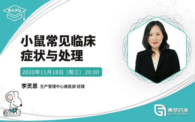 本期集光講壇我們邀請到江蘇集萃藥康生物科技股份有限公司生產管理中心獸醫部經理李靈恩老師為大家帶來《小鼠常見臨床癥狀及處理》線上講座。李老師在動物健康觀察和異常處理方面具有豐富的經驗,相信李老師的精彩講解定會讓你收獲不凡。11月18日(周三)晚8:00,歡迎進入直播間,與李老師在線交流!