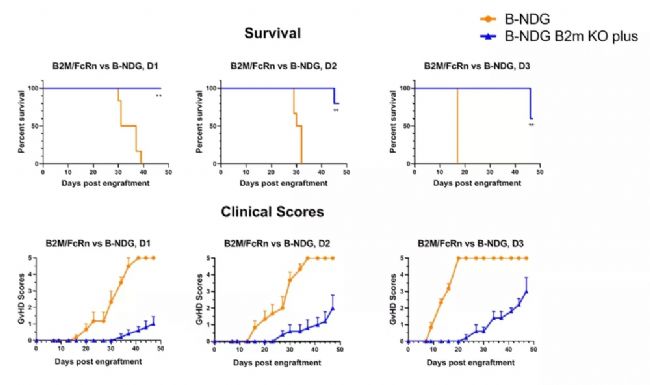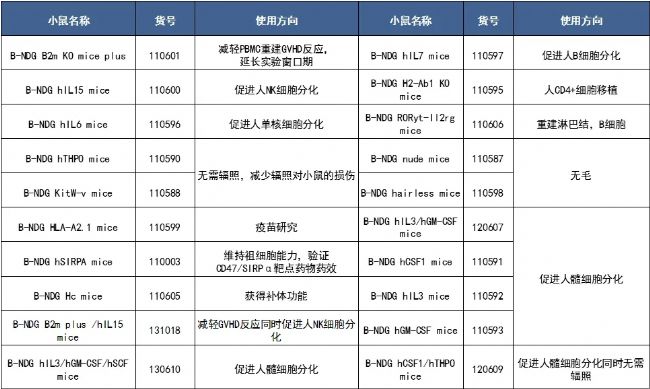 雖然利用NOD-scid-IL2rg null這類小鼠盡管進行人免疫重建已經比較成功,且此類模型也被廣泛的用于人免疫系統的研究,但是這類小鼠造血細胞的維持、分化功能以及免疫細胞的發育是受限的。為了解決這一問題,百奧賽圖在B-NDG小鼠的基礎上,又開發了一系列衍生產品,為人類腫瘤臨床治療研究提供了重要的工具和保障。