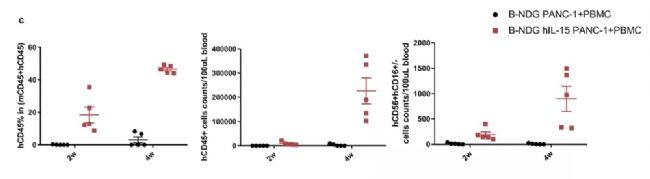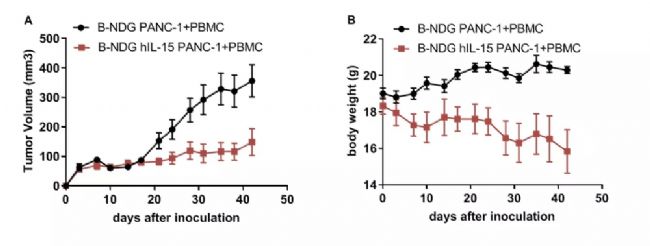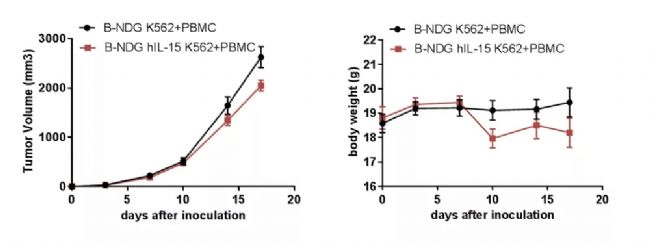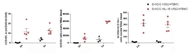 百奧賽圖在重度免疫缺陷B-NDG小鼠基礎上開發了B-NDG hIL15小鼠,基于此進行免疫重建及腫瘤建模,可以滿足更多免疫研究需求,為依賴NK細胞或CD8+ T細胞發揮作用的抗體藥物提供有力的評價模型。