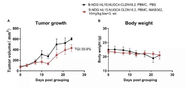 3、PBMC免疫重建B-NDG hIL15小鼠胃癌模型評價CLDN18.2抗體藥效