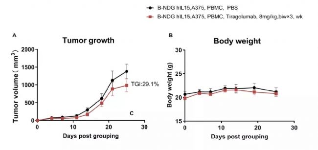 將人PBMC細胞(1E6)靜脈植入純合子B-NDG hIL15小鼠。將A375(4E6)植入B-NDG hIL15小鼠體內。在腫瘤接種后第二天對小鼠進行分組(n=5),并按照圖中所示的劑量和時間表給予Tiragolumab(in house)。(A)給藥期間腫瘤體積變化,(B)給藥期間體重變化。