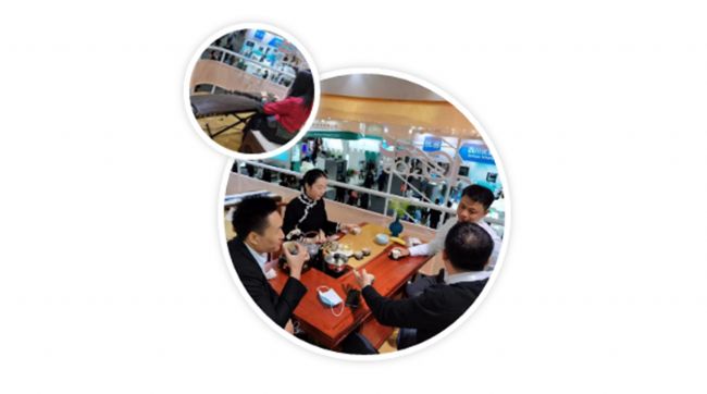 我們展位設計風格獨特,整體以“知楚黃”為主色調。展臺上下兩層設計,一樓展機,二樓洽談。為營造良好洽談氛圍,特請專業茶藝師沏茶,古箏表演者演奏。