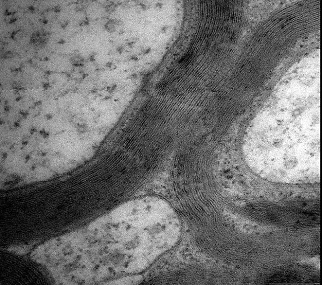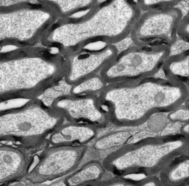 小鼠腦白質有髓神經纖維橫斷面,局部放大高倍透射電鏡圖