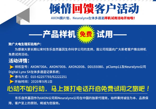 目前我公司獨家代理的AXON膜片鉗系統及Neuralynx在體多通道系統產品均有試用活動,詳情可聯系東樂自然基因工作人員。