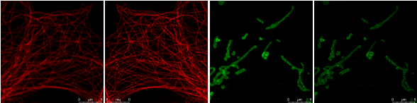 注:左一:常規(guī)共聚焦拍攝的細(xì)胞微管、左二:超高分辨共聚焦拍攝的細(xì)胞微管;