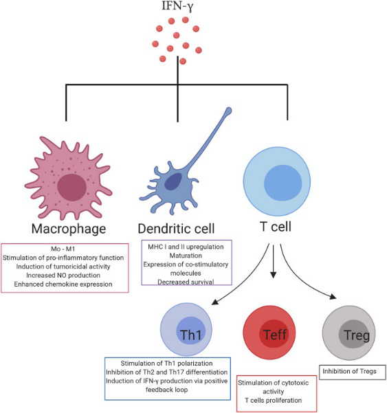 在炎癥或腫瘤的微環(huán)境中,IFN-γ與產(chǎn)生IFN-γ的細(xì)胞(例如T細(xì)胞、巨噬細(xì)胞和樹(shù)突狀細(xì)胞)之間的相互作用。