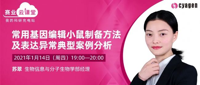 小鼠一直以來都是動物模型中的明星產(chǎn)品,小鼠疾病模型為人類疾病的發(fā)病機制研究和藥物開發(fā)提供了條件基礎(chǔ)。目前常用的小鼠模型制備方法有傳統(tǒng)的轉(zhuǎn)基因,ES打靶技術(shù),以及最為火熱的CRISPR/Cas9核酸酶介導(dǎo)基因編輯技術(shù)。那這三種技術(shù)的異同點是什么?模型構(gòu)建的方案設(shè)計需要考慮哪些因素?基因的表達(dá)驗證可能遇到哪些非常規(guī)的現(xiàn)象?這些問題都將由賽業(yè)生物生物信息與分子生物學(xué)部經(jīng)理蘇翠老師在1月14日(周四)晚7點的直播課程中為大家解答。歡迎長按下方二維碼免費報名參加課程!