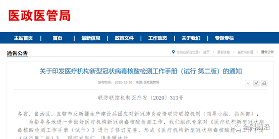 2020年12月30日,我國(guó)衛(wèi)健委發(fā)布《醫(yī)療機(jī)構(gòu)新型冠狀病毒核酸檢測(cè)工作手冊(cè)(試行第二版)》,并強(qiáng)調(diào)要求使用高靈敏檢測(cè)試劑盒(檢測(cè)限≤500拷貝/mL)。