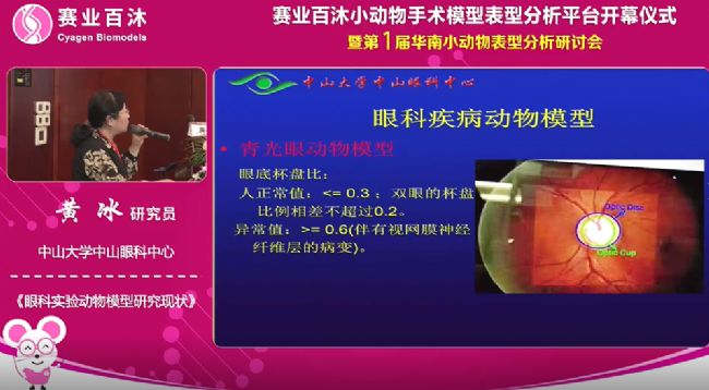在廣東省實驗動物學會指導下,由賽業百沐舉辦的”第一屆小動物表型分析研討會“順利召開。中山大學中山眼科中心黃冰研究員、廣東省動監所心血管疾病模型研究中心楊豐華主任、中山大學附屬第一醫院動物實驗中心蘇喬主任、暨南大學牛海濤教授、南方醫科大學公共衛生學院黃振烈教授、中山大學附屬第一醫院魏泓教授團隊的商海濤博士及賽業生物科學家俞曉峰博士就眼科實驗動物模型研究現狀、小動物心血管疾病手術模型的構建評價和應用、人源腫瘤異種移植模型構建及應用、實驗動物與腸道微生態研究、基因修飾動物模型在環境污染研究中的應用、無菌動物在微生物組研究中的應用、疾病小鼠模型構建技術策略及其應用等議題進行了分享與探討,為線上線下共同參與的逾500位高校師生與業界人士帶來了一場精彩絕倫的學術盛宴。應廣大錯過線上線下研討會的老師強烈要求,我們將陸續給大家分享研討會回看視頻,今天我們分享的是中山大學中山眼科中心黃冰研究員的“眼科實驗動物模型研究現狀”。