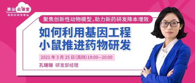 那么,如何利用小鼠模型了解疾病通路并且設計治療干預措施?如何用人源化小鼠模型進行藥物的PK/PD、功效研究以及藥物的臨床前風險評估?這些問題都將由賽業(yè)生物研發(fā)部經(jīng)理孔珊珊在3月25日(周四)晚7點的直播課程中為大家解答。參與課程互動還有機會抽中賽業(yè)生物大禮包一份,快長按下方二維碼免費報名參加課程吧~