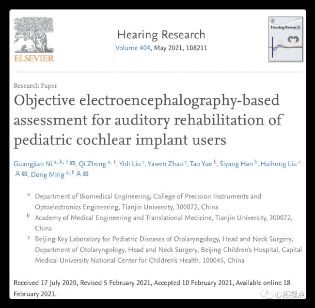 2021年2月18日,《Hearing Research》國際聽力領域最具權威及影響力的專業學術期刊之一,屬于SJR、JCR一區,中科院SCI期刊聽力學與言語病理學、耳鼻喉科學一區雜志接收并發表了由天津大學研究團隊以及首都醫科大學附屬北京兒童醫院研究團隊合作發表的文章《Objective electroencephalography-based assessment for auditory rehabilitation of pediatric cochlear implant users》。利用高密度腦電設備探討了如何有效客觀的評估人工耳蝸植入兒童聽覺康復的方法。