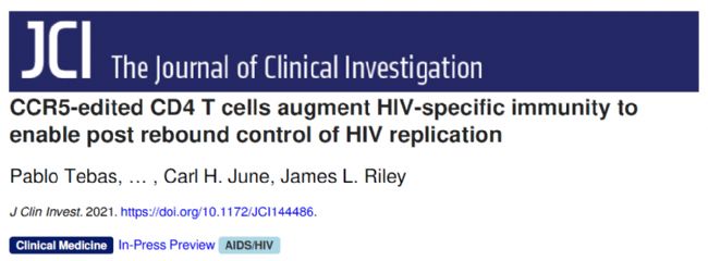 [1] Pablo Tebas, Carl H. June, James L. Riley, et al. CCR5-edited CD4 T cells augment HIV-specific immunity to enable post rebound control of HIV replication[J]. J Clin Invest. 2021.