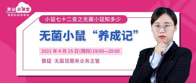 那么什么是無菌小鼠?培養(yǎng)無菌小鼠需要哪些條件?無菌小鼠有哪些應(yīng)用呢?這些問題都將由賽業(yè)生物無菌鼠服務(wù)業(yè)務(wù)主管張征在4月15日晚上7點(diǎn)的直播課程中為大家進(jìn)行講解,參與課程互動(dòng)還有機(jī)會(huì)抽中賽業(yè)生物精美大禮包一份。如果您對(duì)無菌鼠及腸道微生物相關(guān)內(nèi)容感興趣,歡迎免費(fèi)報(bào)名參加課程!