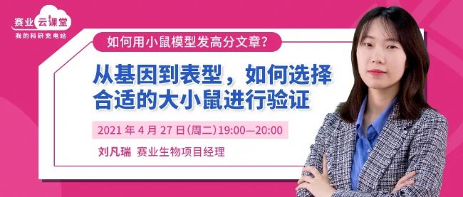 針對上述問題,賽業(yè)生物項目經(jīng)理劉凡瑞將結(jié)合實際研究案例,在2021年4月27日(周二)晚上7點的直播課程中為大家進行深入淺出的講解。參與課程互動還有機會抽中賽業(yè)生物敦煌主題精美禮盒一份。如果您對基因編輯鼠的選擇及應用感興趣或存在疑問,歡迎長按下方二維碼免費報名參加課程并填寫相關(guān)的問題,我們將會篩選出代表性的問題在答疑環(huán)節(jié)統(tǒng)一解答!