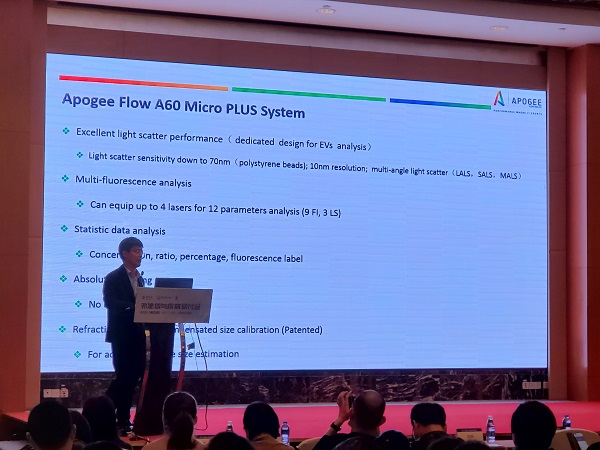 伯齊科技邀請了Apogee Flow Asia 產品經(jīng)理陳連彬博士在大會上做的專題學術報告“評估驗證EVs大量樣品流式分析可靠性的十個因素”受到參會代表的熱烈關注,介紹如何利用Apogee Micro Plus并結合大量實測數(shù)據(jù),重點分享全面評估EVs大量樣品流式分析可靠性的相關因素。會場座無虛席,交流熱烈,吸引了與會嘉賓的熱切關注和高度認可。