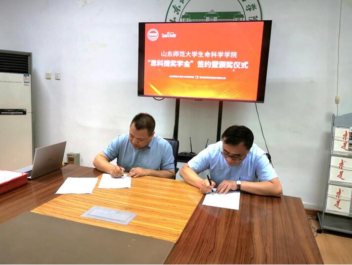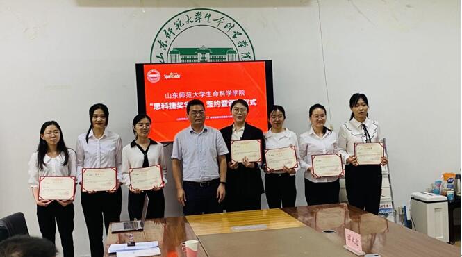 2021年6月15日,在山東師范大學生命科學學院舉行了“思科捷”獎學金簽約暨頒獎儀式。出席此次簽約儀式的有生命科學學院黨委書記于鐵、院長楊桂文、黨委副書記譚效忠、團委書記師靜、青島浩賽科技股份有限公司董事長張小波、山東思科捷生物技術有限公司總經理徐宜鐵。