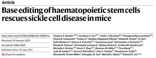 2021年6月2日,博德研究所David R. Liu(劉如謙)等團(tuán)隊(duì)在Nature 在線發(fā)表題為“Base editing of haematopoietic stem cells rescues sickle cell disease in mice”的研究論文,該研究使用定制的腺嘌呤堿基編輯器(ABE8e-NRCH),將SCD鐮狀細(xì)胞病血紅蛋白基因(HBBS) 轉(zhuǎn)換為無害的Makassar β-珠蛋白(HBBG)。研究團(tuán)隊(duì)使用了ABE8e-NRCH 蛋白+sgRNA組成的核糖核蛋白(RNP)或ABE8e-NRCH mRNA+sgRNA,通過MaxCyte電轉(zhuǎn)系統(tǒng)導(dǎo)入到CD34+造血干細(xì)胞和祖細(xì)胞(HSPC)中,對(duì)其進(jìn)行進(jìn)行堿基編輯,檢測(cè)到80% 的 HBBS 轉(zhuǎn)化為 HBBG。將編輯過的人類 HSPC 移植到免疫缺陷小鼠中,16周后修復(fù)后的HBBG基因型占比仍達(dá)到68%,鐮狀細(xì)胞減少了5倍,表明基因編輯是持久的。并且利用MaxCyte電穿孔技術(shù)能夠加快單堿基技術(shù)快速進(jìn)行臨床轉(zhuǎn)化,最大程度保證安全性。