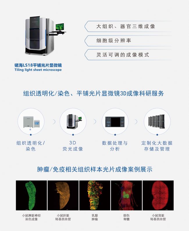 锘海自主研發LS18平鋪光片顯微鏡可實現小鼠全腦、脊髓、骨骼、腎臟、肝臟、乳腺、胰腺、 肺、肌肉及腫瘤等小動物完整器官3D結構呈現。“平鋪光片技術”解決了傳統光片顯微鏡中空間分辨率、光學層析能力和成像視野大小之間的矛盾,滿足高通量、準確定位的熒光成像分析需求,廣泛應用于免疫學、腦科學、腫瘤學、藥物研發、藥物篩選、干細胞研究、組織胚胎學等各個領域。