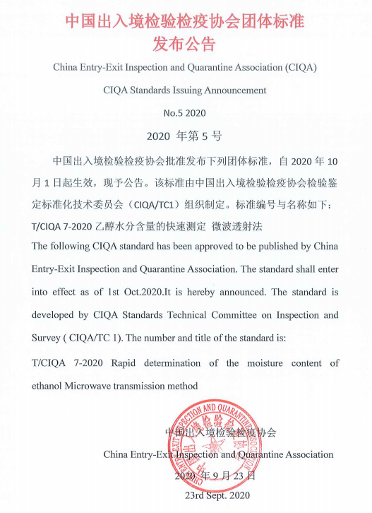 赫西儀器聯合湖南省計量檢測研究院經過多方技術開展合作研究開發,成功完成了消毒酒精測試方法及便攜消毒酒精速測儀,并于2020年10月由赫西儀器起草了“乙醇水分含量的快速測定 微波透射法”,成為中國進出口檢驗檢疫協會抗疫團隊第一標準《T/CIQA 7-2020》,測量方法由上海市激光技術研究所莊松林院士命名——微波透射法:酒精微波水份測試方法是我國獨立自主創新的測試技術,由于它具有快速準確,該方法便攜且不用耗材,操作簡單并可在現場快速檢測,開創了酒精水份測試新紀元。